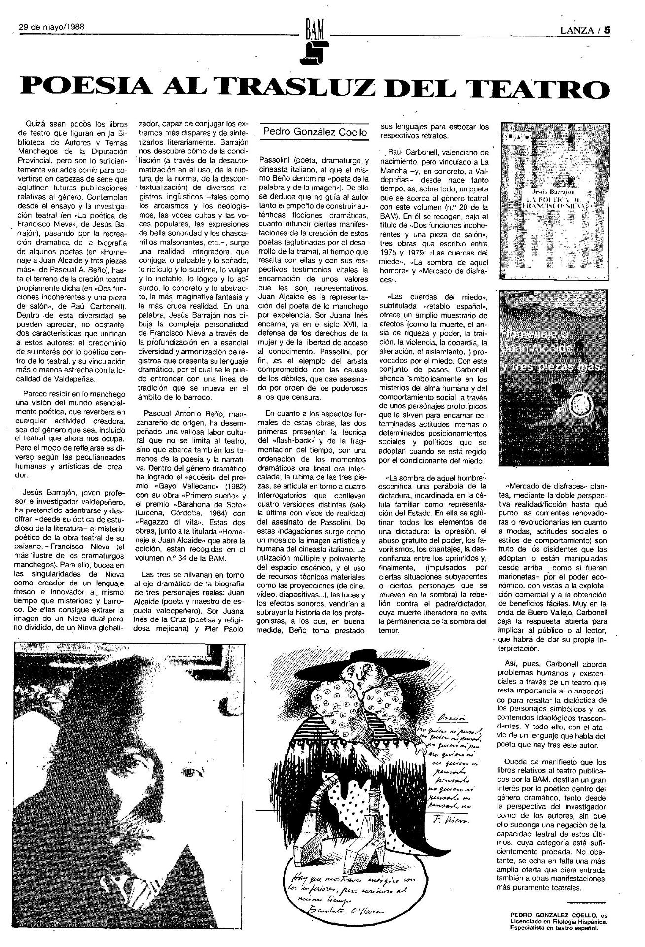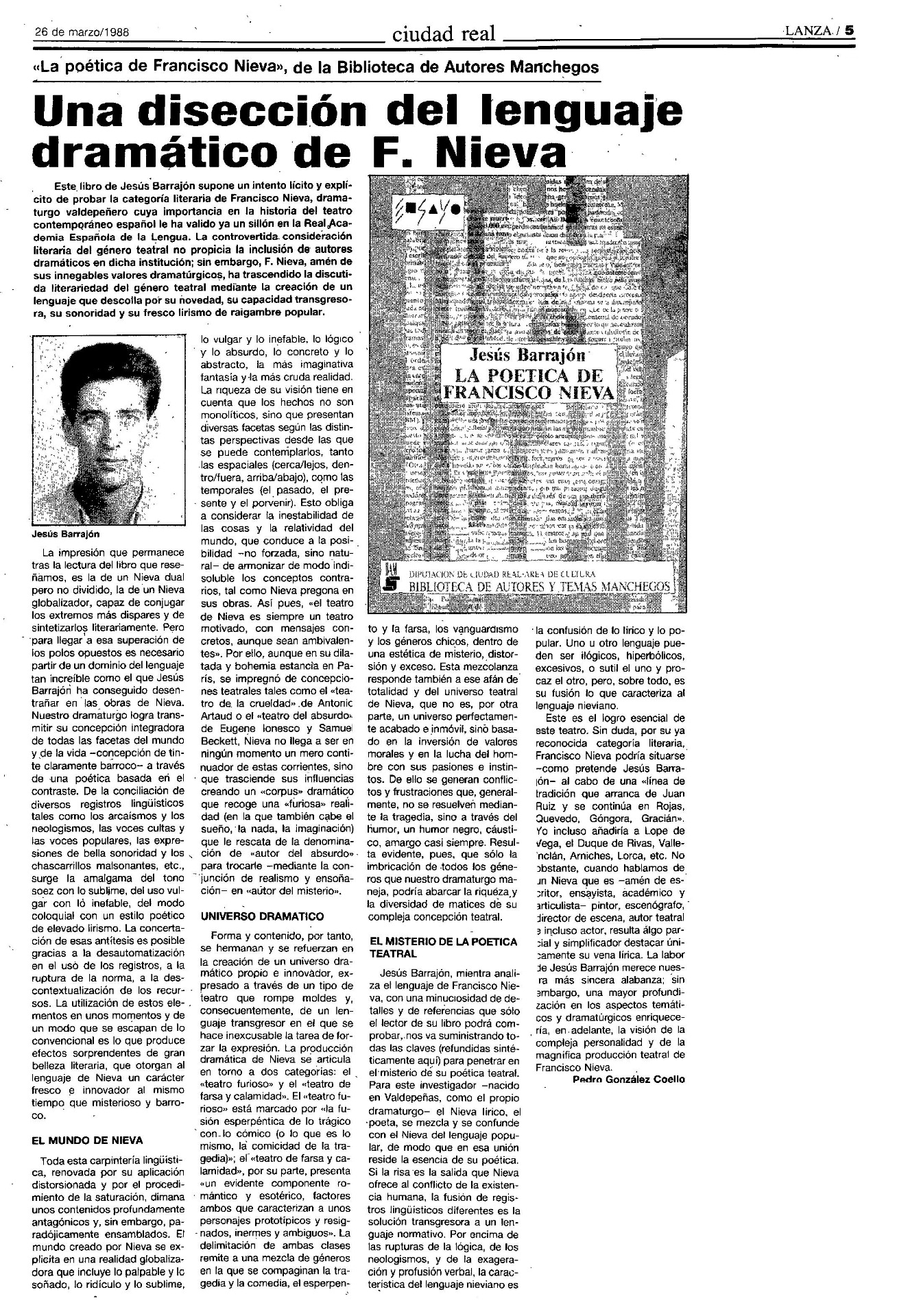 Vayan a continuación dos reseñas críticas sobre varios libros de la Biblioteca de Autores y Temas Manchegos, que en 1988 ponía gran interés por el teatro y la poesía de autores de la tierra, y por el estudio sobre ambas manifestaciones. Estos libros contemplan desde el ensayo y la interpretación teatral (en La poética de Francisco Nieva, de Jesús Barrajón), pasando por la recreación dramática de la biografía de algunos poetas (en Homenaje a Juan Alcaide y tres piezas más, de Pascual Antonio Beño), hasta el terreno de la creación teatral propiamente dicha (en Dos funciones incoherentes y una pieza de salón, de Raúl Carbonell). Dentro de esta diversidad, se pueden apreciar, no obstante, dos características que unifican a estos autores: el predominio de su interés por lo poético dentro de lo teatral, y su vinculación, más o menos estrecha, con la localidad de Valdepeñas. Parece residir en lo manchego una visión del mundo esencialmente poética, que reverbera en cualquier actividad creadora, sea del género que sea, incluido el teatral que ahora nos ocupa. Pero el modo de reflejarse es diverso según las peculiaridades humanas y artísticas de su creador.